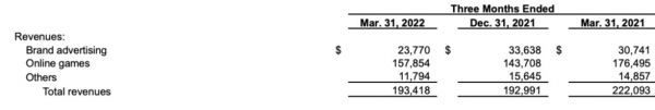从收入情况看,搜狐的处境不算乐观。品牌广告收入持续下降(该板块收入2021年全年收入同比下降了8%),集团的整体营收越来越依赖畅游的在线游戏收入,但这块收入又严重依赖天龙八部。(本季度,搜狐在线游戏收入占到总营收的比例达到82%,该占比在2021年全年为76%,2020年全年为72%。)