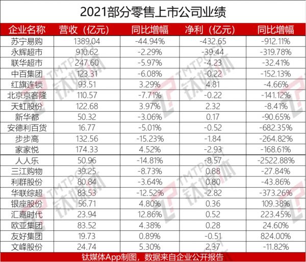 净利润方面,16家企业出现同比下滑,包括人人乐、永辉超市、华联综超等在内甚至成倍下滑,最大降幅更是高达20倍;11家企业出现亏损,其中苏宁易购巨亏432.65亿元,成为2021年度亏损王。