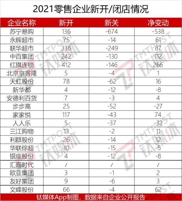 据钛媒体App统计,20家商超上市企业2021年共关闭门店1480家。其中,苏宁易购以674家居首,聚焦家电3C核心业务,其全部关闭了红孩子母婴店面;联华超市以249家次之,包括直营门店54家、加盟店195家;红旗连锁以146家位列第三。