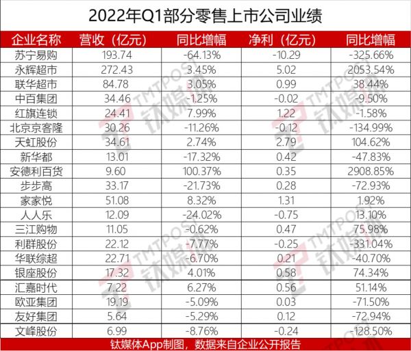 不过,进入2022年,商超零售行业罕见地出现了回暖迹象。第一季度,包括永辉超市、联华超市、安德利百货等在内不仅营收实现同比增长,净利润也转正了,其中,永辉同比大增超20倍,安德利百货同比增幅近30倍。