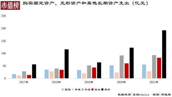 2020年,头部五家企业(三通一达和顺丰)资本开支超360亿,占总营收比重达13.4%。尤其是顺丰,2021年,顺丰资本性开支达192 亿元,同比增长56.5%。韵达和圆通也加大了对于转运中心的相关投入。
