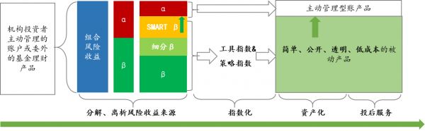 刘凌颐认为,资管市场存在两个赛道,一个是α赛道,上面竞逐的是公募基金、券商、私募基金为代表的管理人,他们追求的是超越基准收益的能力,无数顶级人才、计算资源正在不断投入进去,该赛道已是一片竞争激烈的红海;而资管行业的另一个赛道是β赛道,服务于机构投资者的配置需求,指数公司就在这个赛道上。指数公司的使命,就是不断地分解、离析、刻画资产的风险收益来源,不断精准地定义市场的基准β、不断地通过将α转化成smart β,或者利用β来推高β和α的界限(如下图)。一方面,让投资者能够通过被动投资精准低成本获取其想要配置的风险和收益来源,另一方面也推高市场基准,不断推把α赛道变窄,“逼”出真正高质量的管理人。