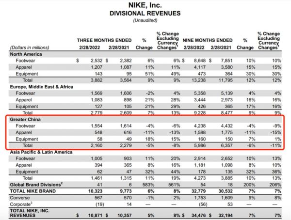 耐克在大中华区的销售业绩同样不佳,已连续两个季度收入负增长。财报显示,截至2021年11月30日的第二财季,耐克大中华区销售收入大跌20%至18.44亿美元;截至2022年2月28日的第三财季,耐克大中华区收入同比下降5%至21.6亿美元。