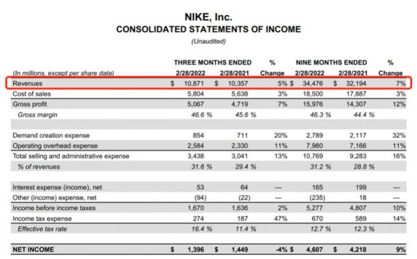 耐克的表现同样不及预期,截至2022年2月28日的三个月内,总销售额同比增长5%至108.7亿美元,净利润下滑4%至14亿美元。