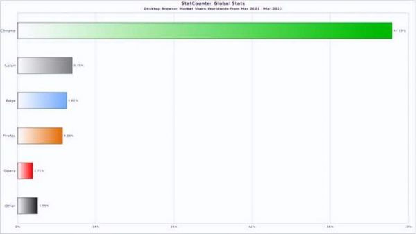 据国际统计网站Statcounter的数据显示,截至今年3月底,浏览器市场份额前三名分别是谷歌浏览器(67.13%)、Safari浏览器(9.75%)、Edge浏览器(8.81%),而IE浏览器的占比不到2%。