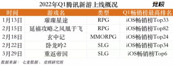 如上图所示,本季度腾讯游戏共推出5款新手游,涵盖了RPG、MMORPG、SLG等热门品类。包括《璀璨星途》《延禧攻略之凤凰于飞》《玄中记》《卧龙吟2》《重返帝国》。