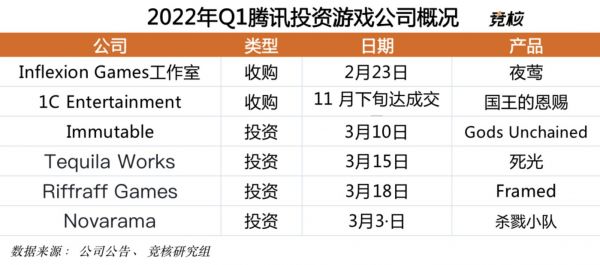 聚焦2022年Q1,腾讯投资的游戏公司约有6家。其中包括,2月23日,腾讯宣布已经从英礴(Improbable)手中收购Inflexion Games工作室;3月31日,腾讯入股了西班牙游戏工作室Novarama。