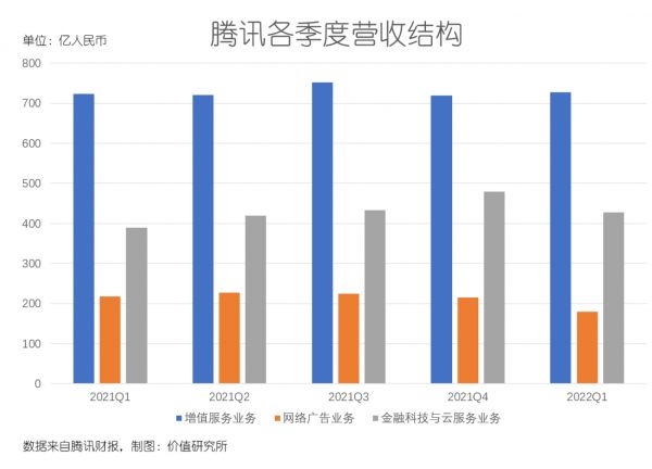 数据显示,一季度腾讯增值服务、网络广告和金融科技与云服务三大业务板块分别收入727亿、180亿和428亿,同比分别增长1%、-17.6%和9.6%。