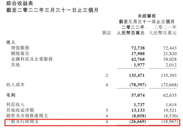 翻看成本结构可以发现,腾讯一季度一般及行政开支同比大涨41%,达到266.69亿,主要就来自于股份酬金开支、研发开支和雇员成本的增加。