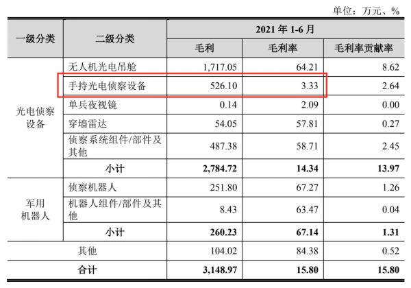 然而2021年上半年公司收入占比最多的手持光电侦查设备毛利率仅为3.3%,是公司毛利率排名倒数第二的产品。2018年、2019年、2020年及2021年1-6月,手持光电侦察设备毛利率逐年下降,分别为41.76%、2.40%、4.95%和3.33%。