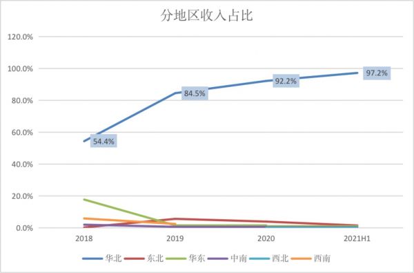 除此之外,客户区域分布也越来越向华北集中,此前开拓的华东、东北地区业务下滑严重,并且中南、西南、西北的业务几乎停滞。