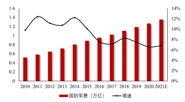 根据财政部公布数据,我国2021年国防军费预算已达到13,553.43亿元,增速为6.8%。近年我国国防军费情况如下图所示,可见军费预算增速已呈逐渐放缓趋势。