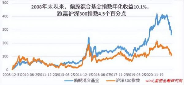 从历史业绩表现看,权益型公募基金的表现还是不错的。当前的市场无疑处于历史底部位置,2008年末以来(截至2022.5.17),偏股混合型基金指数年化涨幅为10.1%,跑赢沪深300指数4.5个百分点,更是大幅跑赢存款和通胀。起点和终点均为市场底部,这个业绩能较为真实地反映偏股型公募基金的投资业绩。