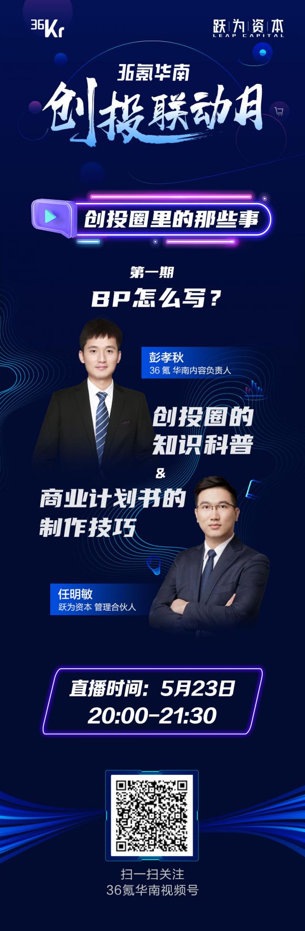 今晚八点,36氪华南创投月|知识科普系列第一期「商业计划书怎么写」就要上线啦。这一次,我们很荣幸邀请到跃为资本管理合伙人任明敏做客36氪华南直播间,一起来为大家分享创投市场的知识科普、前沿资讯和商业机会。