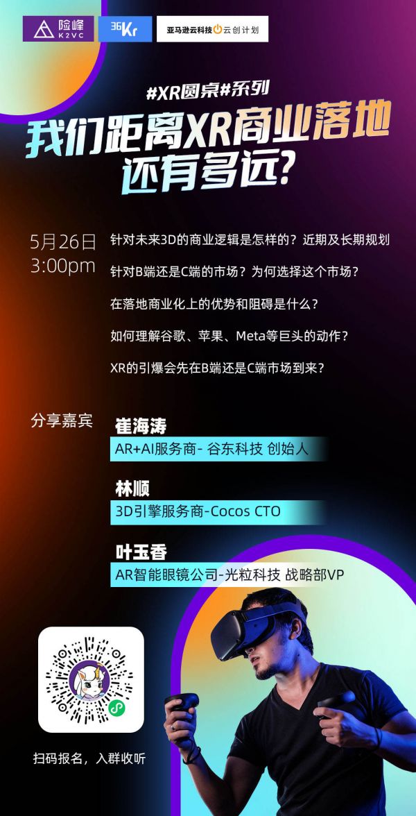 本周,36氪内容中心toB产业部与险峰K2VC、亚马逊云科技-云创计划等多家机构,以“我们距离XR商业落地还有多远”为主题,准备举办一场线上的行业交流闭门会,与XR赛道的头部玩家探讨XR及泛元宇宙领域的行业趋势、赛道见闻、机会和挑战等话题。