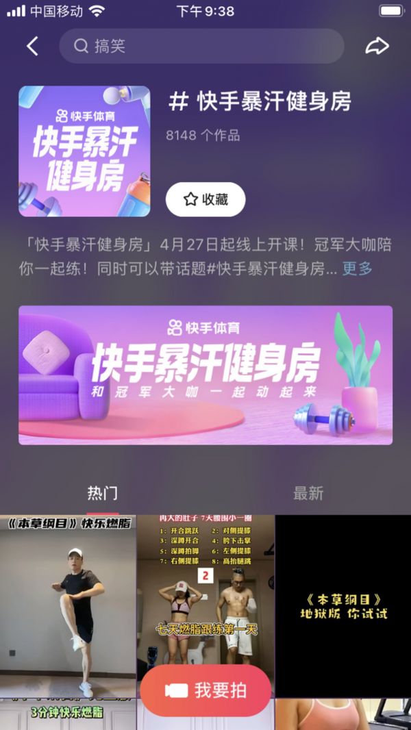 在刘畊宏的毽子操爆火之后,快手也在4月底跟风推出了“暴汗健身房”活动,邀请平台内的体育明星和健身达人共同参与。