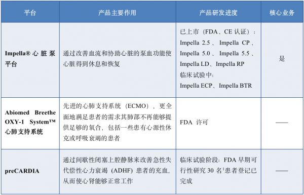 Abiomed产品线布局、作用及产品研发进度