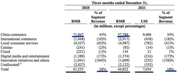 图1:核心商业EBITA的下降导致整体利润率下降。(图源:Alibaba Filings)