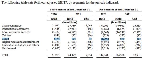 在截至2020年12月31日的9个月里,阿里巴巴的EBITA为负19亿元人民币。在最近9个月期间,这一数字已变为正8.7亿元人民币。这一时期的保证金波动从负4%到正2%。许多云服务提供商在初始阶段利润率较低。在达到更高的收入基础后,他们能够利用规模经济带来更好的利润率。