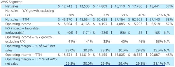 图4:亚马逊的AWS在过去几个季度的营业利润率接近30%。(图源:Amazon Filing)