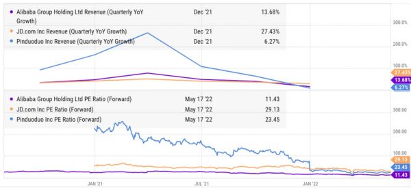 图5:阿里巴巴的远期本益比明显低于京东和PDD(图源Ycharts)