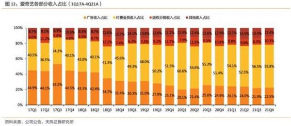 爱奇艺收入主要由几部分构成:会员付费、广告收入、版权分销和其他。同样是在2019年,会员收入占比超过50%之后,就一直是公司收入的顶梁柱。会员收入占比最高的一个季度是在2020年Q1,达到60%,其他时间基本都在55%左右徘徊。