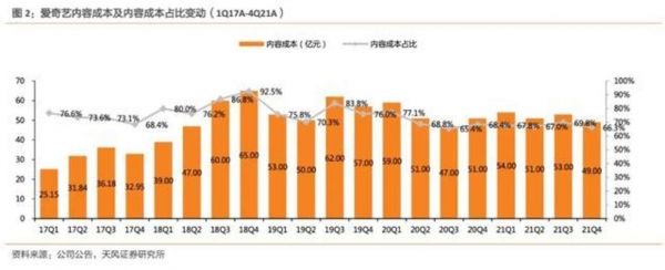 这是过去5年,爱奇艺的内容成本投入和成本占比,是最大头的成本支出项。2022年Q1,内容成本为44亿元,是2018年以来的历史最低。