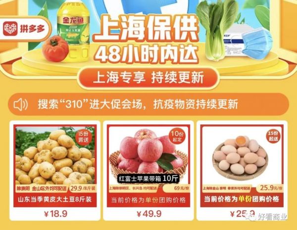 尤其是在疫情严重导致封城的上海,拼多多和多家电商平台、生鲜电商平台一起,成为抗疫保供的单位之一。