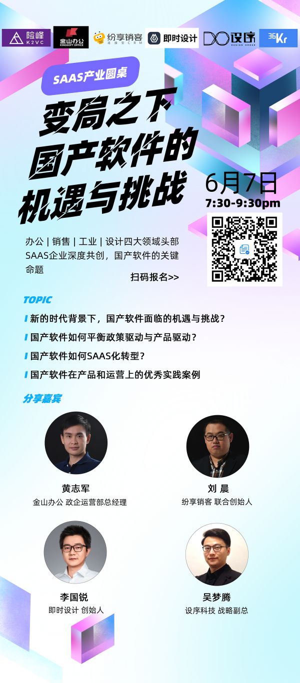 本周,36氪与险峰K2VC邀请了办公、销售、工业、设计领域的头部SaaS公司,以“变局之下国产软件的机遇与挑战”为主题,准备举办一场线上的行业交流闭门会,与国产软件赛道的头部玩家们共同探讨这个领域的行业趋势、赛道见闻、机会和挑战等话题,包括但不限于以下话题: