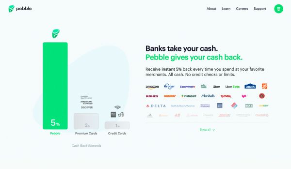 创始人表示,传统信用卡提供商依赖Visa和Mastercard等中间商、欺诈保护服务机构和其他第三方来处理交易,因此能为客户提供的现金奖励比较低。相比之下,「Pebble」直接与商户建立合作,一方面充当品牌方的拓客渠道,另一方面以礼品卡的形式向消费者发放奖励,以吸引用户。