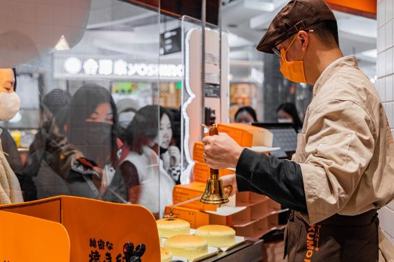 姜浩文表示,产品是品牌的核心,但“产品”不仅是芝士蛋糕本身,而是包括整个门店。「KUMO KUMO」以橙色为主色调,采用“前店后厂”的模式,由于芝士蛋糕全部现场制作,所有员工上岗前都需培训21天,确保把握产品要求和品牌核心理念。消费者在排队过程中会看到透明厨房内的全部制作流程,蛋糕出炉后店员会摇起摇铃,品牌希望通过这一看似简单的动线设计增加线下烘培店的体验感。“前期,光是摇铃就在国内外采购了近200种进行实验,我们想尽可能在细节处做得用心一些。”