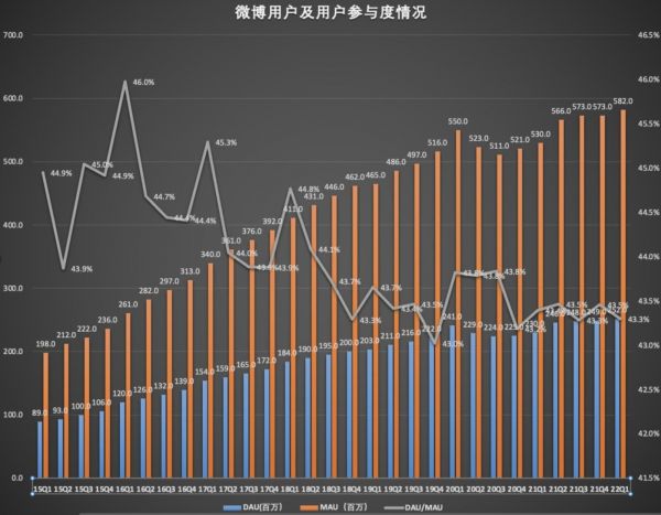 用DAU/MAU来衡量微博用户参与度,异观财经发现微博用户的参与度并未取得实质性的改变,甚至处于下行趋势。2022年一季度微博用户参与度从上一季度的43.5%下行至本季度的43.3%。