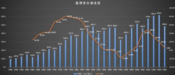 财报显示,2022年第一季,微博营收4.85亿美元,同比增长6%,营收增速放缓。