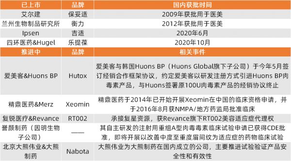 2020年10月26日,北京四环医药发布公告称,由公司独家代理、韩国生物制药公司Hugel生产的“注射用A型肉毒毒素(Letybo ,乐提葆)于2020年10月21日正式获国家药监局批准上市,成为第四个获准在中国上市的A型肉毒毒素。