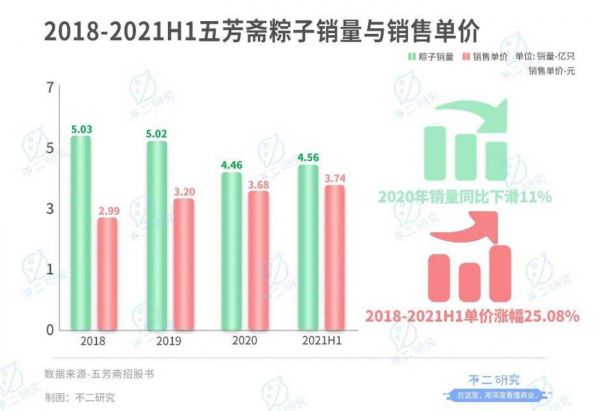 招股书显示,五芳斋的粽子销量也呈现下滑态势,2018-2021上半年分别为5.03亿、5.02亿、4.46亿只与4.56亿只,2020年销量同比下滑11%。