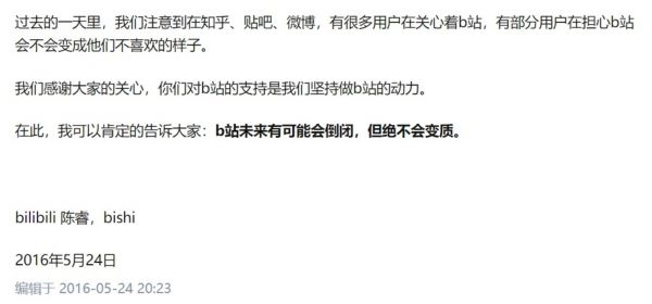 2016年5月24日,面对诸多用户对B站番剧中贴片广告的质疑,陈睿以一种当时看来相当庄重的方式在知乎评论区写下回答,并留下了那句著名的话,“B站未来有可能会倒闭,但绝不会变质。”