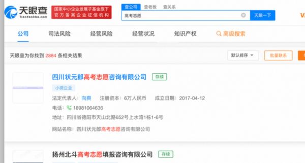 来自天眼查APP研究院的一份数据显示,2011年-2020年间,志愿填报相关企业注册量逐渐增加,2016年,相关企业还不足百家,到了2020年这个数字已经增长到1,500家。如今,根据天眼查APP显示,搜索高考志愿相关的企业有2884条结果,其中除了一些传统的教育咨询服务机构之外,不少企业开始通过大数据技术来提供志愿填报服务。