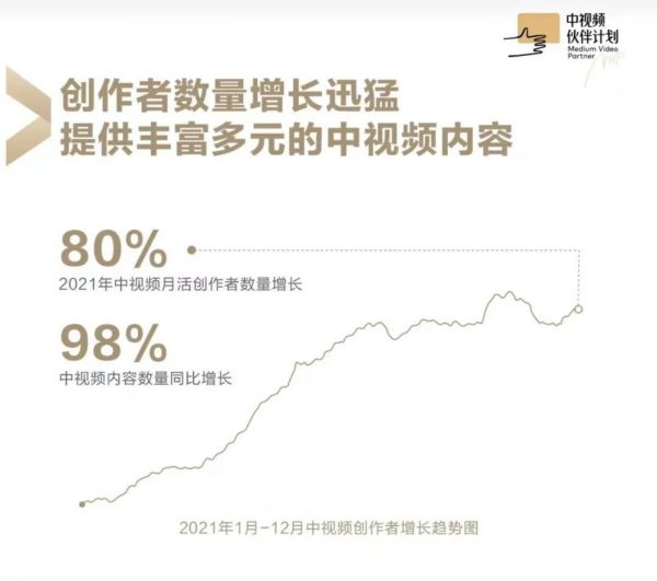2022年1月,西瓜抖音今日头条联合发布的中视频2021发展趋势报告显示,2021年中视频创作者在西瓜视频、抖音和今日头条上,月活中视频创作者数量同比增加80%。