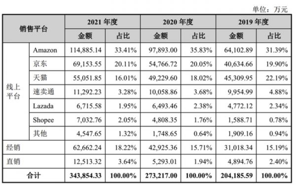 事实上,即使到今天,亚马逊都是绿联的主要销售渠道之一。招股书显示,2019年-2021年,绿联来自亚马云的营收金额分别为6.41亿元、9.78亿元和11.49亿元,占营收的比重分别为31.39%、35.83%和33.41%。