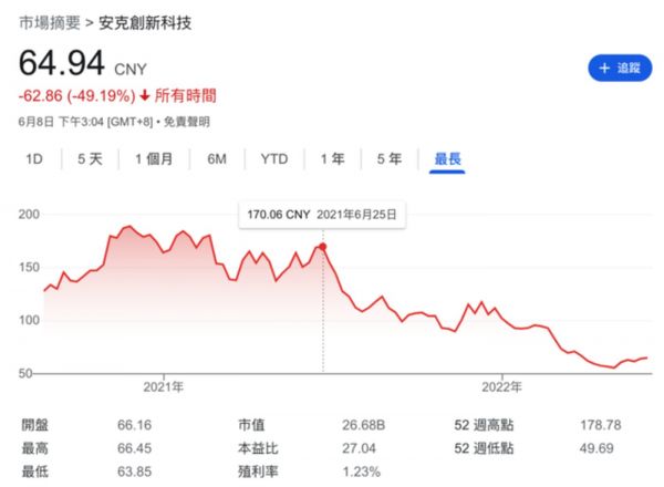 二级市场上,安克创新的股价表现也波动下行。截止2022年6月8日收盘,安克创新股价仅为64.94元/股,相较于一年前170元/股左右的高点,下跌了61.8%。