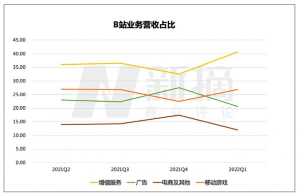 增值服务、移动游戏、广告、电商是B站四大营收板块,一季度分别贡献了20.52亿、13.58亿、10.41亿和6.03亿元。