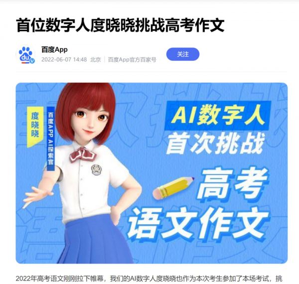 6月7日,在高考作文题目公布的第一时间,百度推出的“首个高考数字人助理”度晓晓交了一份新高考Ⅰ卷“本手、妙手、俗手”的材料作文,被曾经的北京高考语文阅卷组组长打了48分。