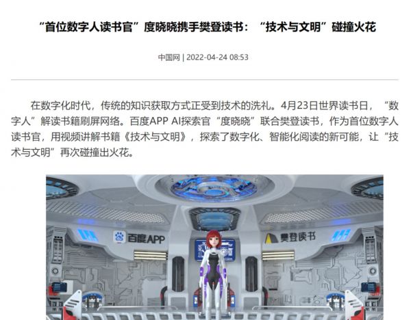 到了今年4月(也就是2022财年的Q1),度晓晓的身份开始变了,营业力度明显上升。在世界读书日,它化身首位数字人读书官,视频推书。