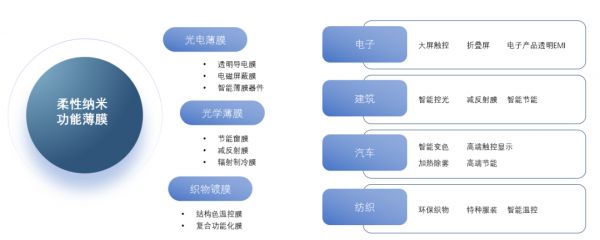 该产线的年产能可达100万平米。同时,依托公司量产线及中试线,「纳诺特」广泛拓展了卷绕式磁控溅射制备柔性纳米功能薄膜的平台型技术,已在光电薄膜、光学薄膜和织物镀膜领域开发了多种先进功能产品,在电子信息、建筑、汽车和纺织等领域具有广泛应用。「纳诺特」规划在近期新建多条产线以进一步扩大产能并拓展产品线。