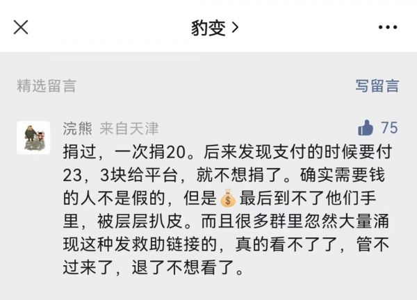 此外,大病众筹平台自身盈利模式也被不少人诟病。《豹变》此文点赞最高的是一位天津网友“浣熊”的留言:捐过,一次捐20,后来发现支付的时候要付23,3块给平台,就不想捐了。确实需要钱的人不是假的,但是钱最后到不了他们手里,被层层扒皮。而且很多群里忽然大量涌现这种发救助链接的,真的看不了了,管不过来了,退了不想看了。