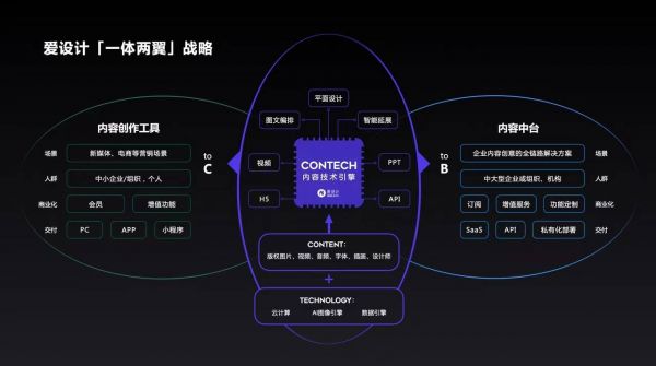 但除了B端的成就之外,在“一体两翼”的产品战略坚持下,「爱设计」同样具有优秀的C端用户体验。其中,“一体”是指以内容资源和云计算为底层的技术支撑、结合多元化媒体内容在线编辑的「内容技术引擎」,而“两翼”是指延展出来面向C端和B端两类用户场景的应用产品及解决方案。目前,「爱设计」已经通过智能设计平台为个人用户提供了覆盖主流媒体格式、能够实现多端操作与交付的智能内容生产服务。