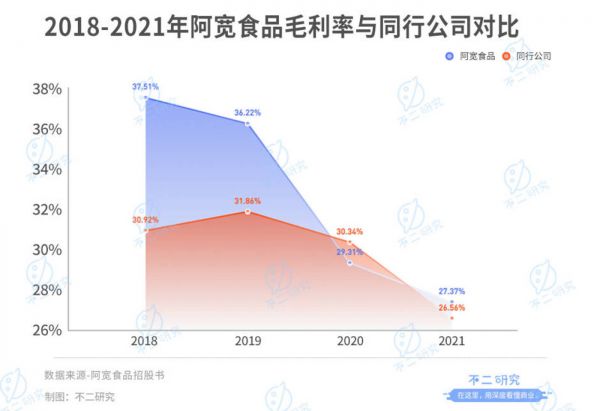 毛利率增长的转折点则来得更早。招股书显示,2018-2021年,阿宽食品的主营业务毛利率分别为37.51%、36.22%、29.31%和27.37%。从2020年开始,阿宽食品的毛利率逐年下降,并丧失市场优势,低于行业平均值。