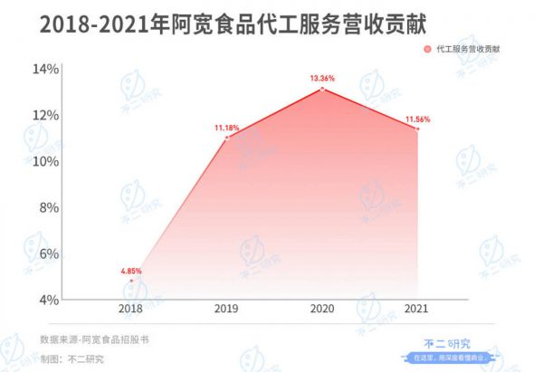 由于产品配料众多、供应链分散,方便食品品牌普遍采用代工模式生产。为三只松鼠、百草味、李子柒、网易严选等客户提供贴牌代工服务,也成为了阿宽食品一项重要的营收来源,2018~2021年营收贡献分别为4.85%、11.18%、13.36%和11.56%。
