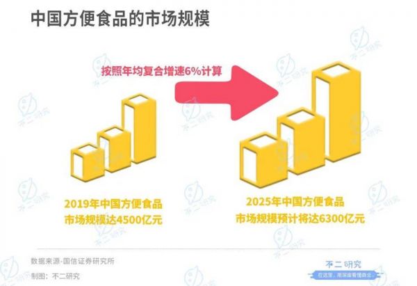 根据国信证券研究所,2019年中国方便食品的市场规模达4500亿元,若按照年均复合增速6%计算,2025年方便食品的市场规模预计将达6300亿元。