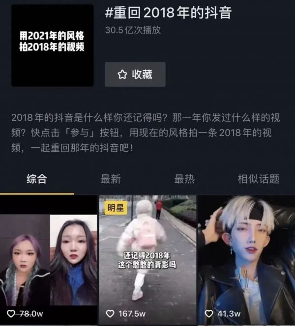 若将这样一条视频和#重回2018年抖音话题下的视频相对比,差距将更加明显。2018年的抖音,流行的是卡点变装、运镜变焦和丰富多彩的音乐及乍听起来十分炫酷的小语种神曲。在各方面,2018年的抖音都向外界强调自己的新潮。